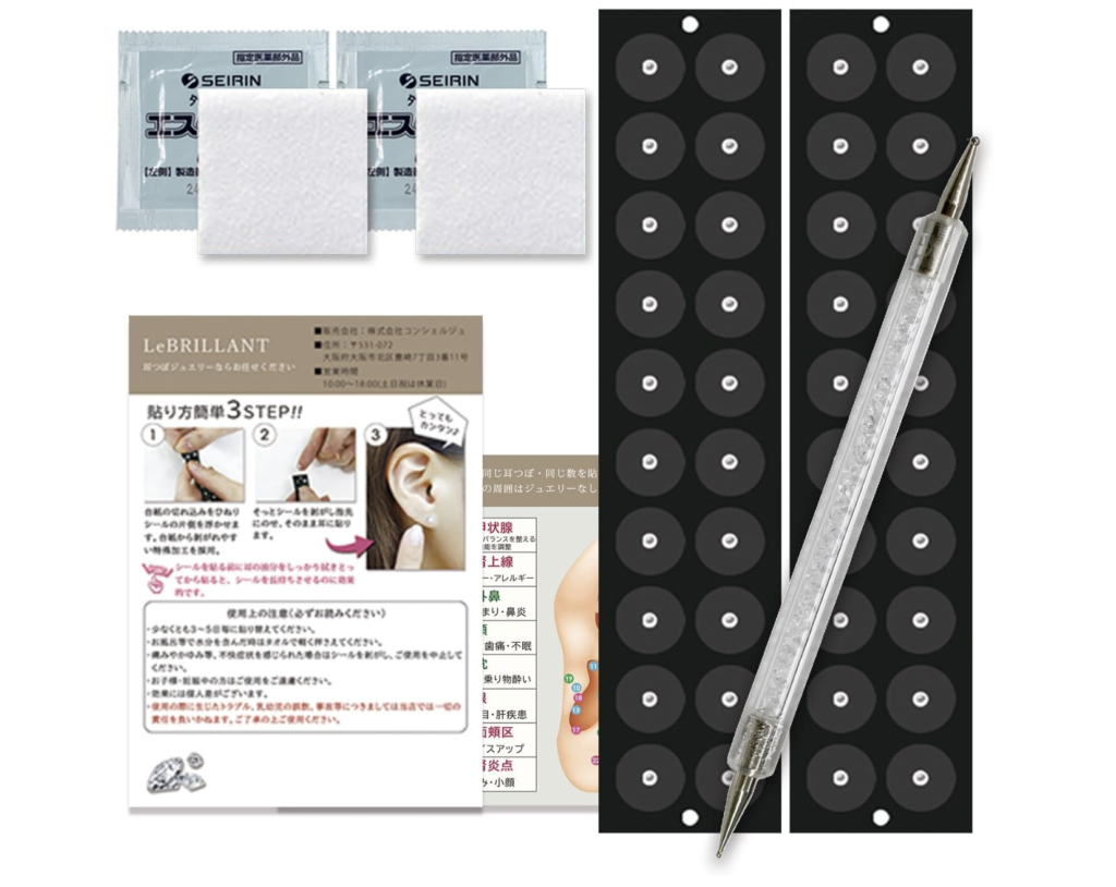 耳つぼシールに加えて、耳つぼ解説図やピンセット(またはつぼ押し)がセットになっており、初めての方でも使いやすい内容になっています。